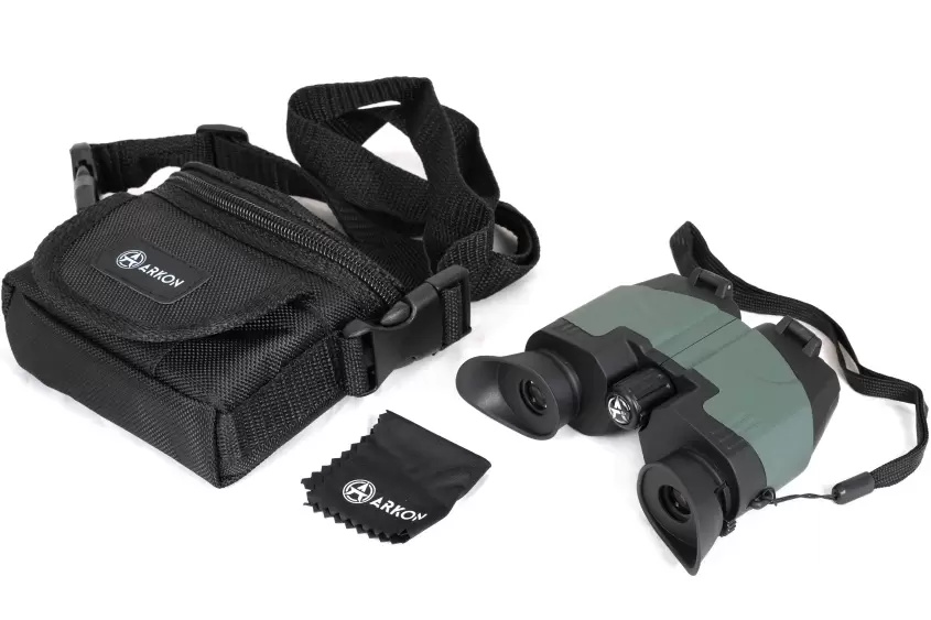 В оптической схеме бинокля Arkon 8х21 применены перевернутые призмы Порро (Porro). Такая конструкция обладает своей особенностью, при которой межосевое расстояния объективов меньше, чем такое же расстояние у окуляров. Оптическое увеличение постоянное и составляет 10 крат. На внешние поверхности линз нанесено многослойное просветляющее покрытие, которое обеспечивает получение яркой и красочной картинки с максимально реалистичной цветопередачей. Угол пространственного поля зрения FOV (Field of view) имеет значение 7°, что в переводе на линейные размеры обеспечивает видимость области пространства шириной 122 метров на удалении в 1 километр. Диаметр выходного зрачка равен 2,6 мм, а его вынос 10 мм. На окулярах имеются резиновые наглазники скошенной формы, которые полностью исключают вероятность боковой засветки. Фокусировка на дистанцию производится путем вращения специального барабана, находящегося между окулярами. Минимальная дистанция, на которую можно навести резкость, составляет всего 5 метров. Для выравнивания естественной разницы зрения между правым и левым глазом предусмотрена возможность диоптрийной корректировки правого окуляра.